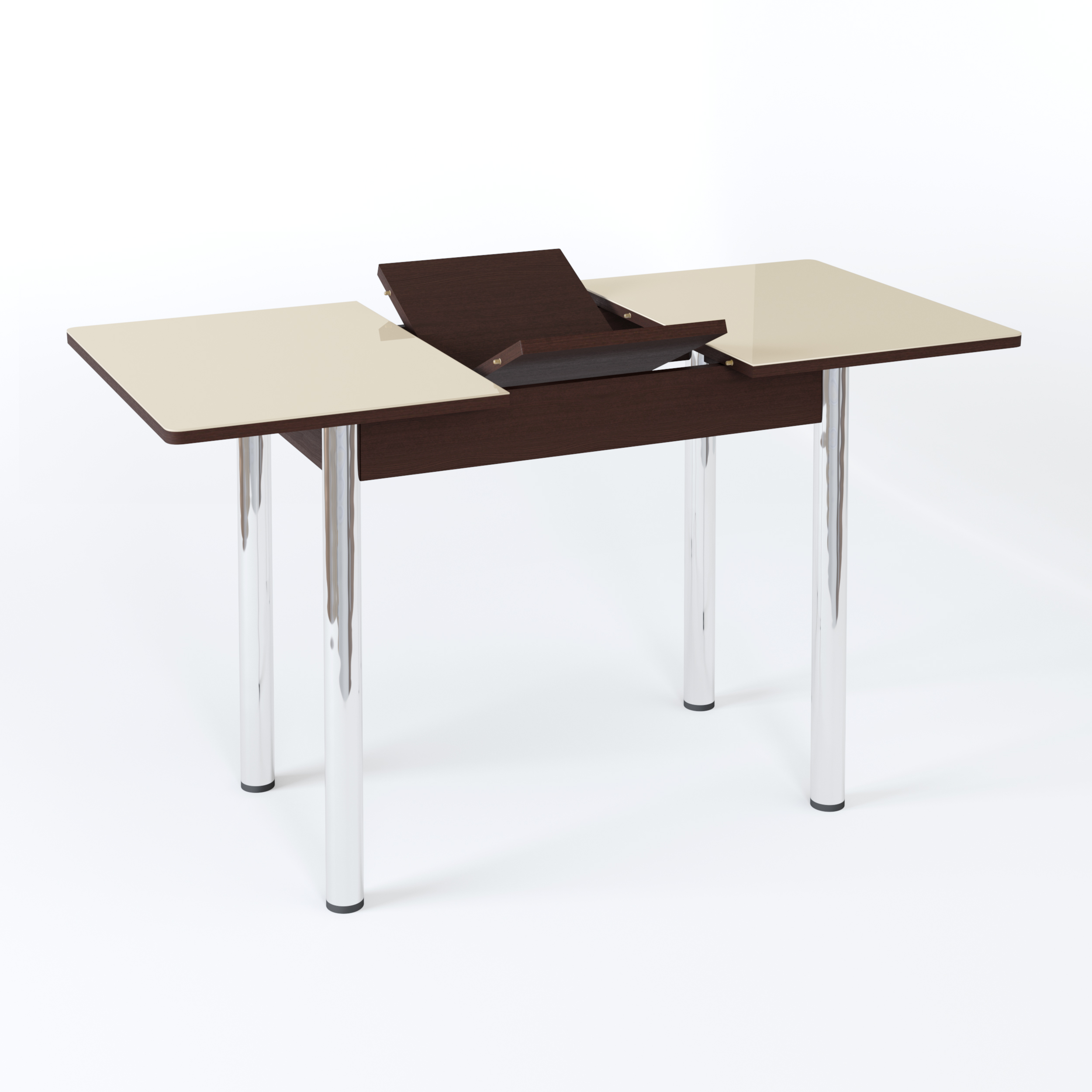 Длина прямоугольной столешницы - 90 см, с помощью механизма “бабочка” ее можно еще немного увеличить - до 1 м 20 см. Изготовлена она из сочетания ЛДСП и МДФ, сверху - закаленное окрашенное стекло. Возможны варианты с кожзамом, фотопечатью. Ноги прямые или гнутые, могут быть сделаны из хромированной стали или массива березы белого, кремового или цвета венге. В любой комбинации служат надежной опорой изделию даже в разложенном виде.